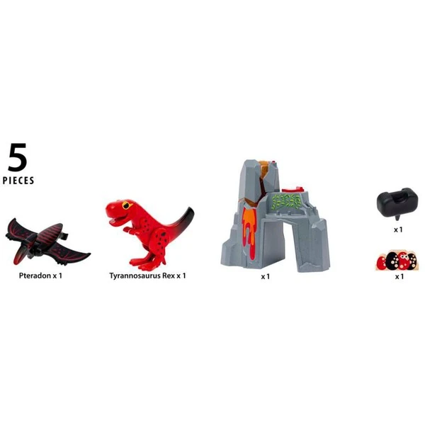 Mit dem Dinosaurier-Vulkan mit Ausbruchsfunktion wird aus der klassischen BRIO-Bahn ein prähistorisches Abenteuer! Der Vulkan wird durch Drücken des kleinen Knopfes auf seinem Gipfel zum Leben erweckt – schon wird das Licht von glühender Lava sichtbar, Vulkangeräusche ertönen und der Dampfeffekt aus dem Vulkanschlot wird aktiviert. Wenn der Vulkan ausbricht, steht T-Rex stolz auf dem Gipfel und überblickt sein Königreich. Er ist eine von zwei Dino-Figuren mit beweglichen Teilen, die sich im Lieferumfang dieses Dino-Sets befinden.Art.-Nr.: 100057750