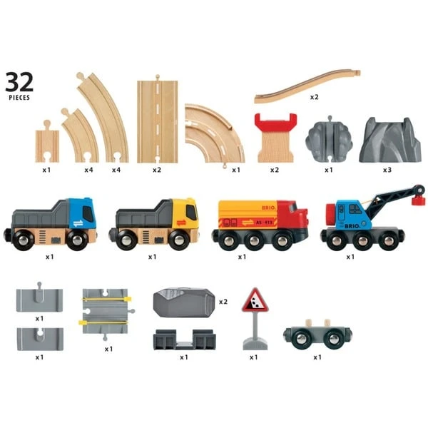 Be- und Entlade-Spaß pur! In diesem Set stecken jede Menge Spielideen, einschließlich zwei Lastern und einem Zug mit Kranwagen. Mit ihm kannst Du jederzeit Ladungen von Güterwaggons runter oder rauf heben. Hieve die schweren Steine von den Waggons und lade sie auf die Laster. Du bringst sie sicher an den Ort ihrer Bestimmung.Art.-Nr.: 1447516