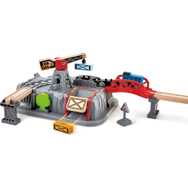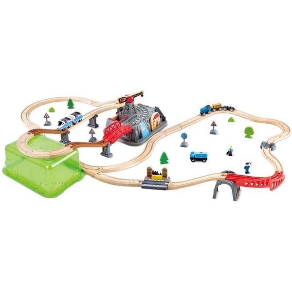 | Inhalt/Ausstattung | 1 Freilauflokomotive, 2 Wagen, 2 S-Schienen, 8 gebogene Schienen, 4 gerade Schienen, 2 unregelmäßige Schienen, 1 Bergschiene, 5 Kunststoffstützen, 1 Aufstiegsschiene, 2 Pinienbäume, 1 Blattbaum, 1 einfacher Kran, 1 rote Brücke, 1 Eisenbahnschild, 1 Verkehrsschild, 5 Kleinwerkzeuge, 1 Figur, 1 Reparaturstation, 1 Aufbewahrungsbox mit Deckel und Holzdekorblöcken | ||