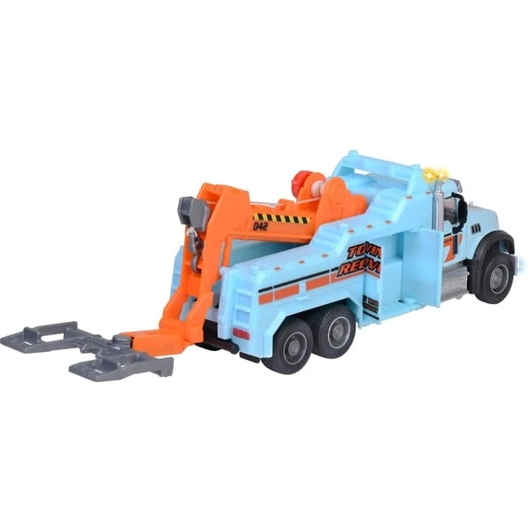 Dieser tolle Spielzeug-Abschleppwagen verfügt über viele Funktionen und ist mit insgesamt 5 Signalleuchten sowie zwei verschiedenen Sounds vielfältig ausgestattet. Wie bei einem echten Abschleppwagen gibt es einen Kran mit Seilwinde und Haken sowie eine schwenkbare Abschleppgabel. Staufächer an den Seiten nehmen Kleinteile auf.Art.-Nr.: 1916105