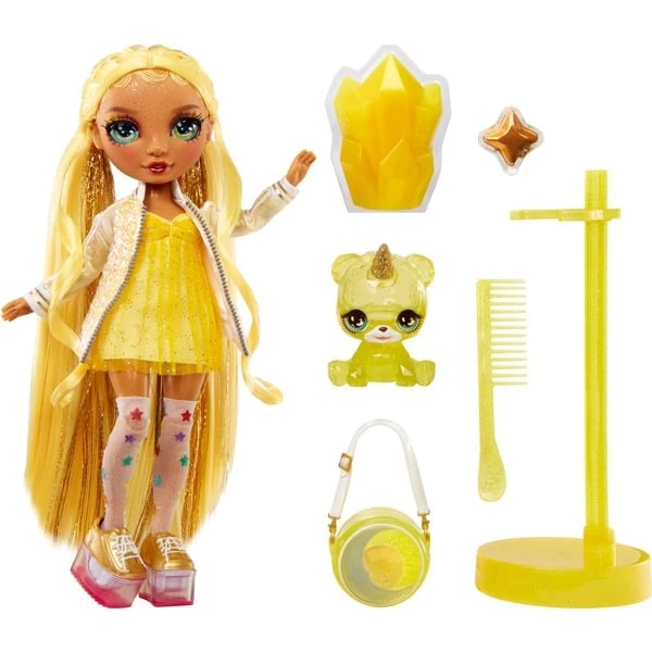 Sunny bringt sonnige Glanzmomente in die Welt von Rainbow High! Als strahlender Star der Classic Rainbow High Fashion Doll-Kollektion zeigt Sunny sich in einem spektakulären Outfit. Die bewegliche Puppe begeistert mit langem, kämmbarem Haar, das zum Stylen einlädt. Ihre modischen Accessoires, wie eine schicke Handtasche und perfekt abgestimmte Plateau-Schuhe, vervollständigen ihr Ensemble. Ein Haustier im passenden Glitzerlook, ein Puppenständer sowie das faszinierende Pulver für den Liquid Rainbow-Zauber sorgen für abwechslungsreichen Spielspaß. Mit Sunny und ihren funkelnden langen Glitzerwimpern wird die Welt ein bisschen heller – die perfekte Freundin für kreative Styling-Abenteuer!Art.-Nr.: 100043967