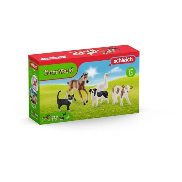 Dieses Set beinhaltet fünf Bauernhof-Tiere: Ein Fleckvieh-Kalb, eine Katze, einen Border-Collie, eine Gans und ein Mustang Fohlen. Auf dem Bauernhof sind ein Fleckvieh-Kalb und ein Mustang-Fohlen geboren worden. Sie sind noch etwas unsicher auf den Beinen, tapsen aber mutig über den Hof. Die Gans schnattert aufgeregt zur Begrüßung, und der Border Collie beschnuppert die beiden freudig, während die Katze das friedliche Bauernhofleben gemütlich von einem sonnigen Platz aus beobachtet. Die Schleich Figuren sind alle detailgetreu modelliert und liebevoll bemalt. Art.-Nr.: 1832526