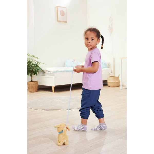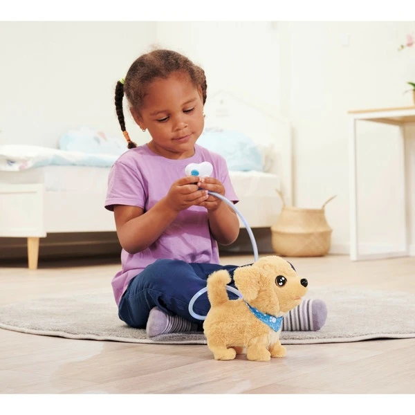 Die beliebten ChiChi LOVE Hunde greifen aktuelle Modethemen auf und sind mit trendiger Kleidung und vielen Accessoires ausgestattet. Der Golden Retriever trägt ein blaues Tuch und kann richtig laufen, bellen und mit dem Schwanz wedeln. Die weiße Fernbedienung in Form eines Hundeknochens ist mit einem Kabel am Hündchen verbunden und kann leicht gesteuert werden. Ein besonderes Highlight ist die leuchtende Leine. Die Lichtfunktion erscheint automatisch sobald eine Taste gedrückt und gehalten wird. So können Kinder auch im Dunkeln mit ihrem Hündchen Gassi gehen. Das 20 cm große ChiChi Hündchen ist für Kinder ab 3 Jahren geeignet. Der Plüschhund ist kuschelweich und freut sich auch über Streicheleinheiten.