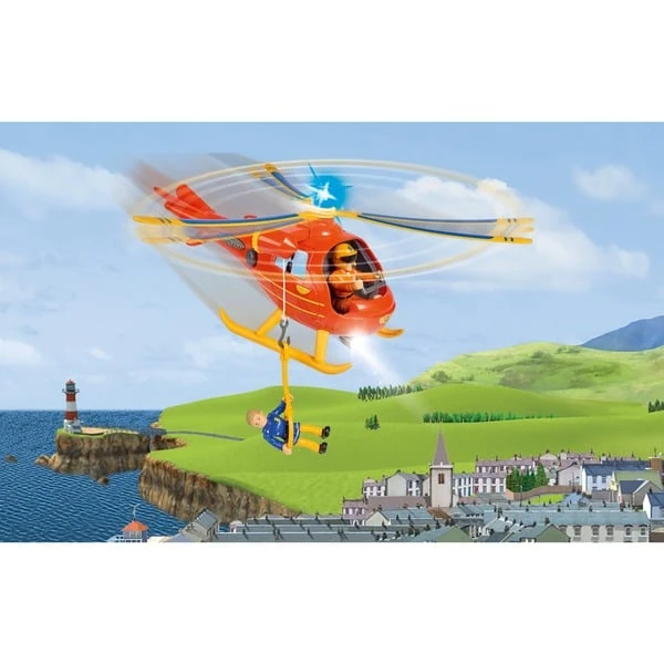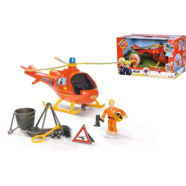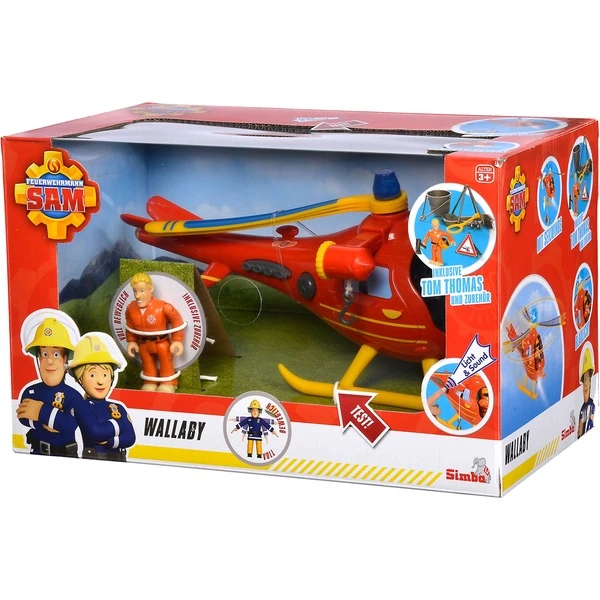 Hubschrauber Wallaby ist eines der Einsatzfahrzeuge von Feuerwehrmann Sam und seinen Kollegen aus Pontypandy. Hinter dem Steuer hat Tom Thomas Platz genommen. Mit dem 15 cm großen Hubschrauber werden Unfallpersonen mit der Trage schnell ins nächste Krankenhaus geflogen oder Feuer mit dem Bottich aus der Luft gelöscht; Trage oder Bottich werden an der Seilwinde befestigt. Am Heck des Hubschraubers kann mit Tastendruck das Blaulicht aktiviert werden; dabei ertönt ein cooler Originalsound. Damit Pilot Tom auch in der Dunkelheit auf Rettungsmission gehen kann, ist Wallaby mit einem Suchscheinwerfer ausgestattet; eine Seilwinde und viel Zubehör vervollständigen die Ausstattung des Hubschraubers.Art.-Nr.: 1788534