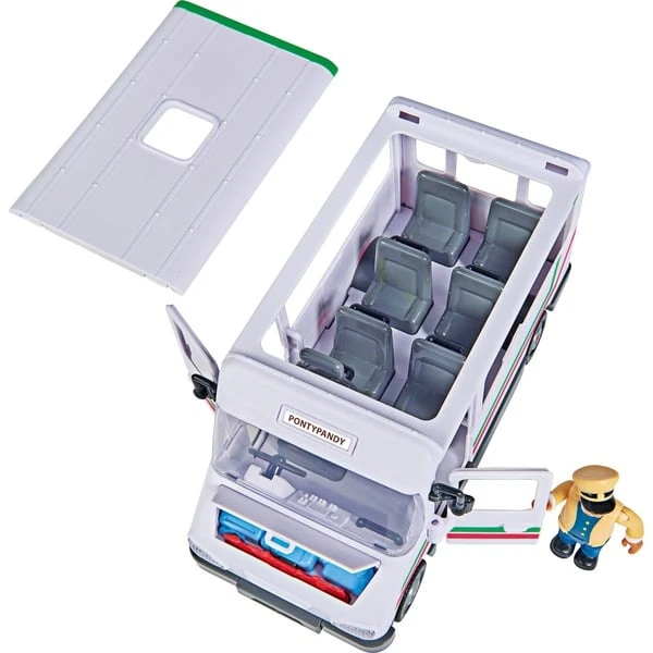 Trevor aus Pontypandy und sein Bus sind nicht selten Einsatzgrund für Feuerwehrmann Sam und sein Team. Baut Trevor mal wieder einen Crash, indem er mit seinem Bus frontal auf einen Gegenstand oder eine Wand auffährt, so springt die Motorhaube auf und Flammen kommen zum Vorschein. Je nachdem wie man die Räder vorher auf dem Bus feststeckt, fährt das Fahrzeug entweder geradeaus oder aber die Räder eiern. Das Dach des Busses lässt sich abnehmen, so dass Passagiere leicht auf den Sitzplätzen platziert werden können. Trevors Bus von Simba Toys kommt mit einer Trevor Figur und viel Zubehör. Für Kinder ab 3 Jahren geeignet.Art.-Nr.: 1661260