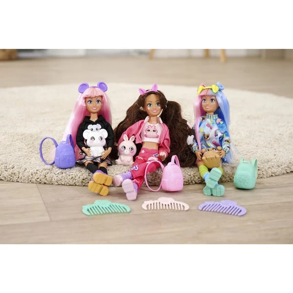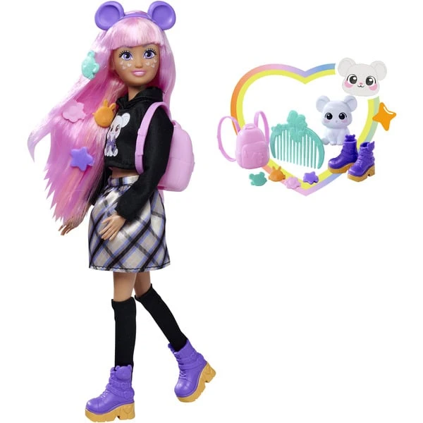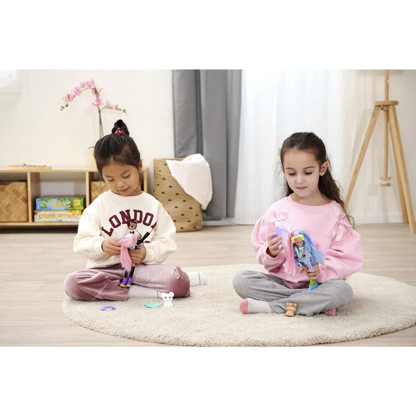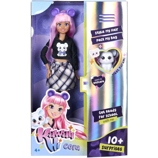 Willkommen an der „Kawaii Hi“ – der High-School, an der Mode, Individualität und Freundschaft im Mittelpunkt stehen! Inspiriert vom japanischen „kawaii“-Trend – kawaii bedeutet so viel wie „niedlich“ – begeistern die Kawaii Hi-Puppen Kinder ab 4 Jahren mit stylischen Outfits, süßen Looks und extra-langen Haaren, die sich fabelhaft frisieren lassen. Jede der etwa 26 Zentimeter großen Ankleidepuppen hat ihren ganz eigenen Stil und bringt verschiedene Überraschungen mit, deren Inhalt beim Aufklappen der Verpackung enthüllt wird. Cora ist die super-coole Styling-Ikone. Mit ihren langen, rosa Haaren und einem trendigen Outfit aus Rock und Pulli punktet Modepuppe Cora mit einem lässigen Alltagslook, der sich vielseitig kombinieren lässt. Passend zu ihrem Style wird die Puppe von der niedlichen Maus Kurumi begleitet. Die voll bewegliche Puppe lädt zu kreativen Styling- und Ankleide-Sessions ein – ein Traum für junge Fashion-Fans mit eigenem Stil. Neben dem weichen Haar zum ausgiebigen Kämmen und Stylen warten coole Extras, darauf, entdeckt zu werden: Schuhe, Kamm, Rucksack oder bunte Haar-Accessoires sorgen für immer neue Looks und Frisuren.Art.-Nr.: 100125138
