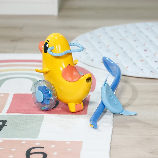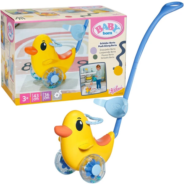 Mit fröhlichem Watschelgang, rasselnden Rädern und einem liebevoll gestalteten Entenkörper bringt Schiebe-Berta ordentlich Bewegung ins Puppenspiel. Ob im Kinderzimmer oder draußen auf dem Gehweg – dieses bunte Spielzeug wird schnell zum treuen Begleiter für kleine Puppeneltern ab drei Jahren. Statt als Laufhilfe für Babys ist Berta bewusst als Teil des kreativen Puppenspiels konzipiert: Sie fährt nicht einfach nur mit – sie kann viel mehr: Mit ihrer stabilen Lenkstange, dem praktischen Geheimfach für Zubehör oder kleine Schätze und den charakteristischen Rasselrädern verbindet sie Bewegung, Fantasie und soziale Interaktion auf spielerische Weise. Mit einem Plüschtier im Sattel und ein paar Schätzen im Fach unter dem Rücken begleitet sie Kinder auf fantasievollen Spaziergängen oder durch das eigene Zuhause. Dabei bleibt sie leicht genug zum Schieben und ist stabil genug für den Einsatz drinnen und draußen.Art.-Nr.: 100144204
