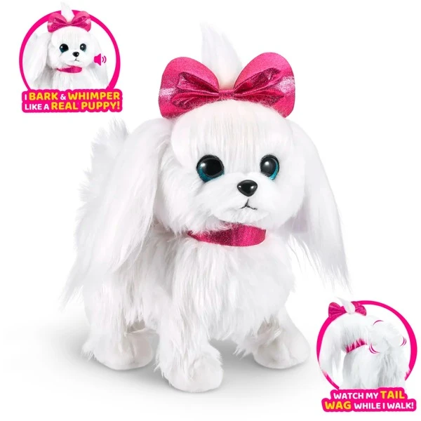 Dieser Welpe ist einfach zu süß: Sein weiches, weißes Fell ist wie gemacht zum Bürsten und Kuscheln und seine glitzernden blauen Augen funkeln genauso wie die rose Schleife und das Halsband. Wenn Paw Paw mit der Leine ausgeführt wird, dann wackelt er mit dem Schwanz und bellt dazu. Die Steuerung erfolgt über die Leine.Art.-Nr.: 1913557